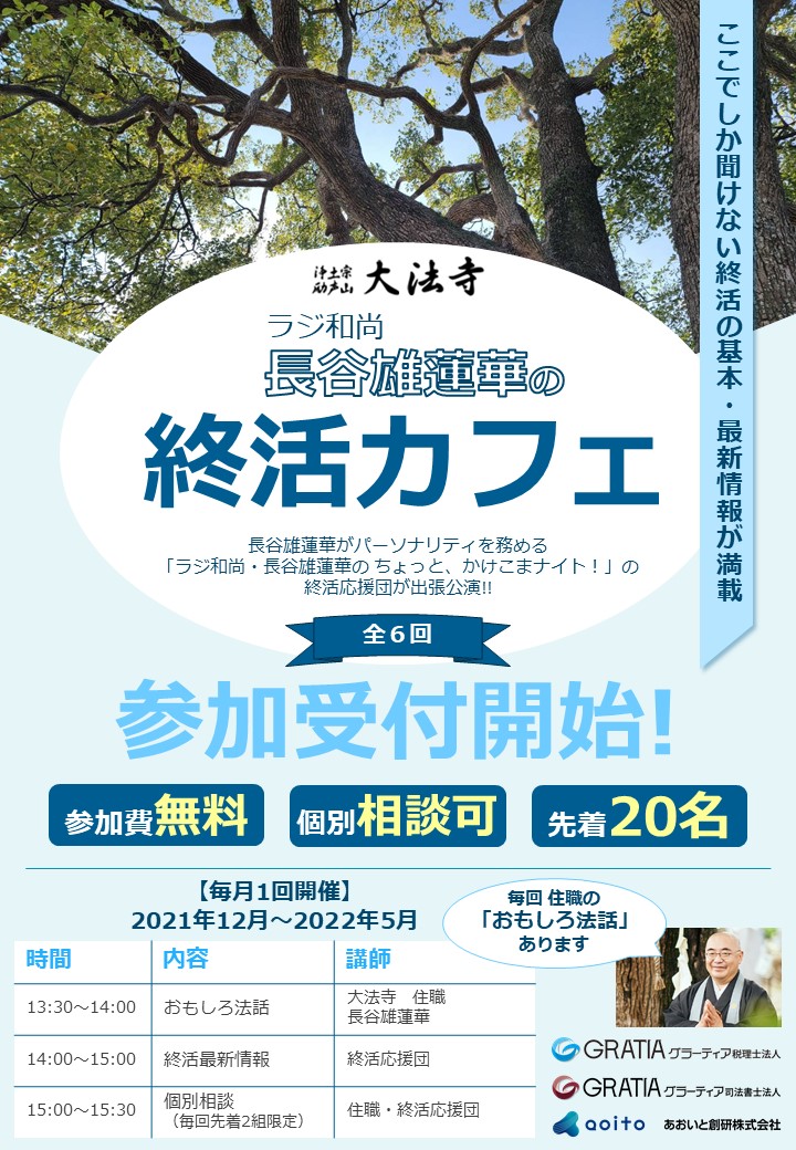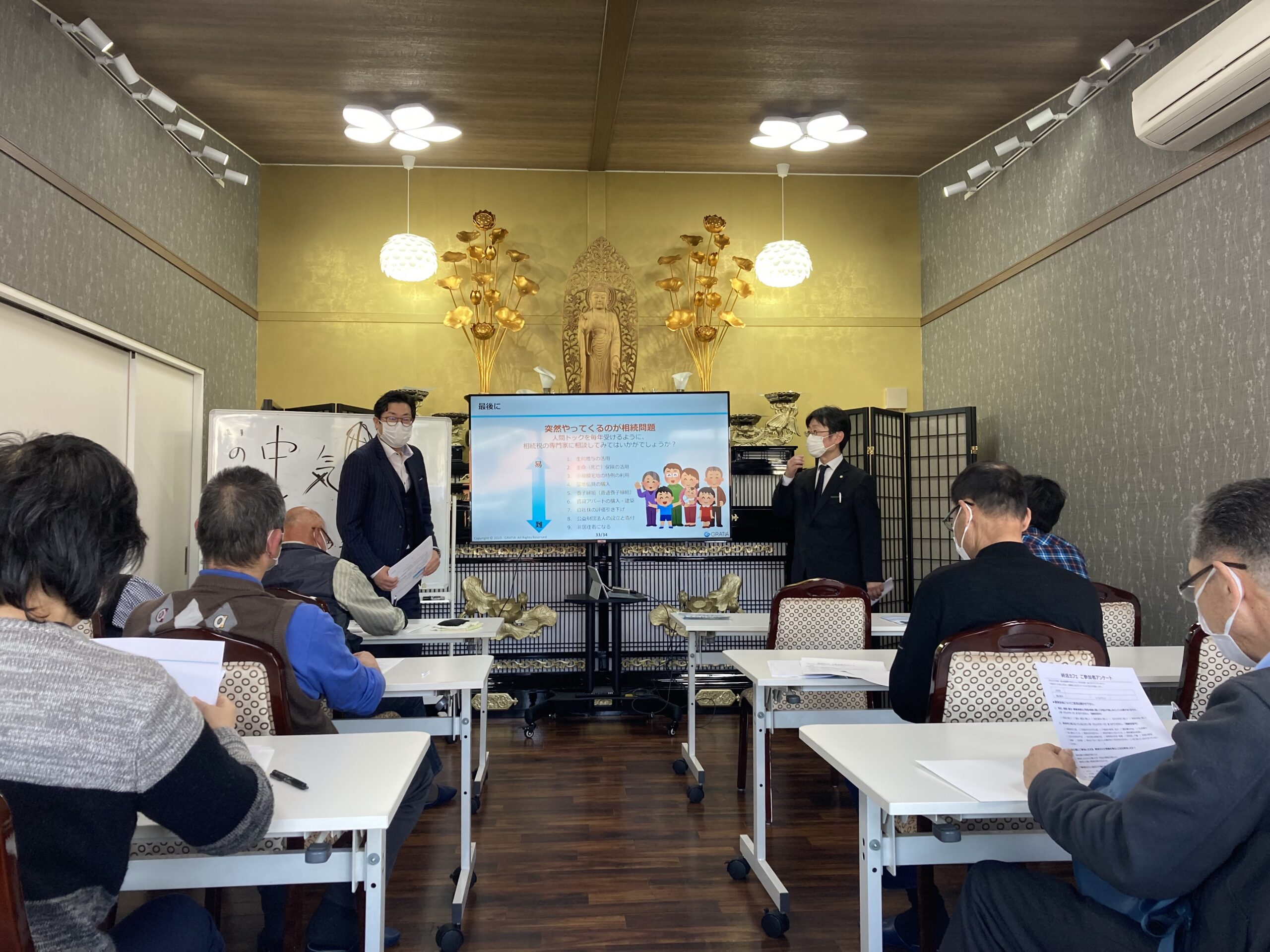 | 詳細 | 13:30~14:00 「おもしろ法話」大法寺 住職 長谷雄蓮華 14:00~15:00 「認知症リスクに備える家族信託」 グラーティア税理士法人 税理士 鈴木辰哉 15:00~15:30 個別相談会 |